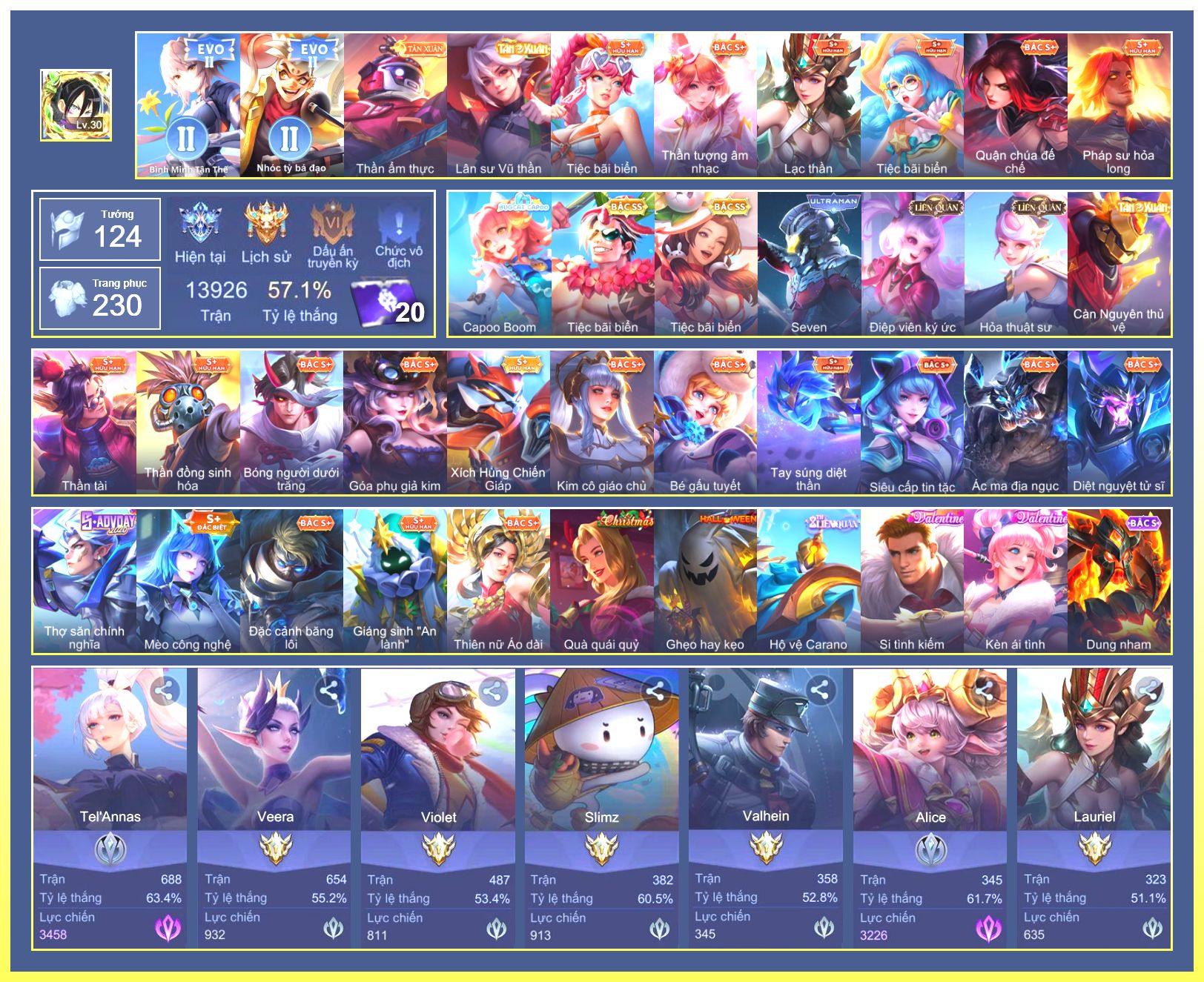 Nổi bật: Rất Nhiều Skin Đẹp Vip.Ngọc 90.Dư 4 Đá Quý.Flo Seven.Valhein Xạ Thần.Alice Bé Gấu Tuyết.Zuka Gấu Nhồi Bông.Valhein Khiêu Chiến.Max Thần Đồng Sinh Hóa...