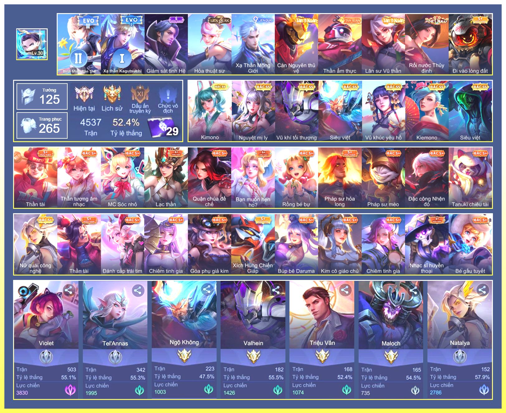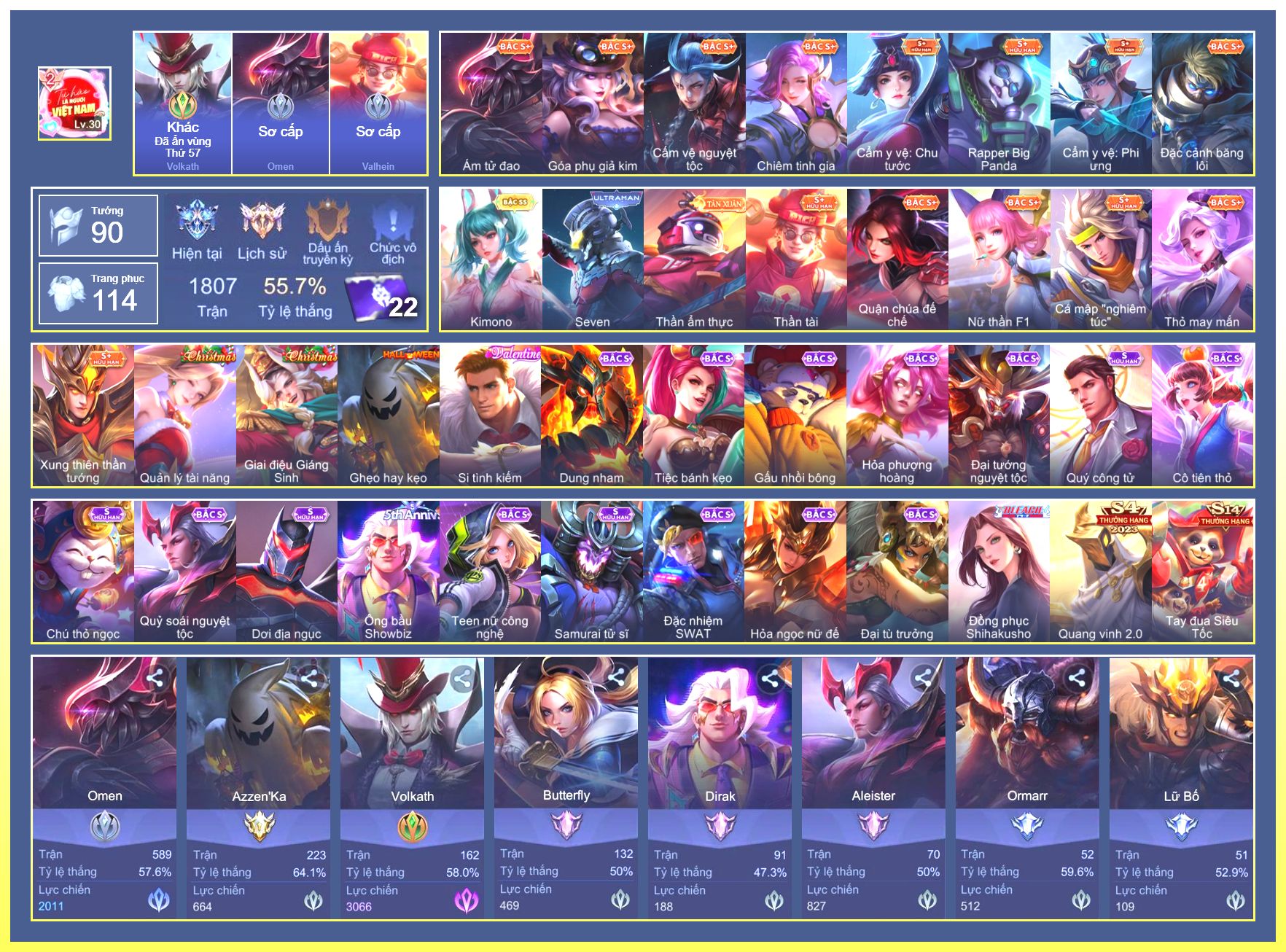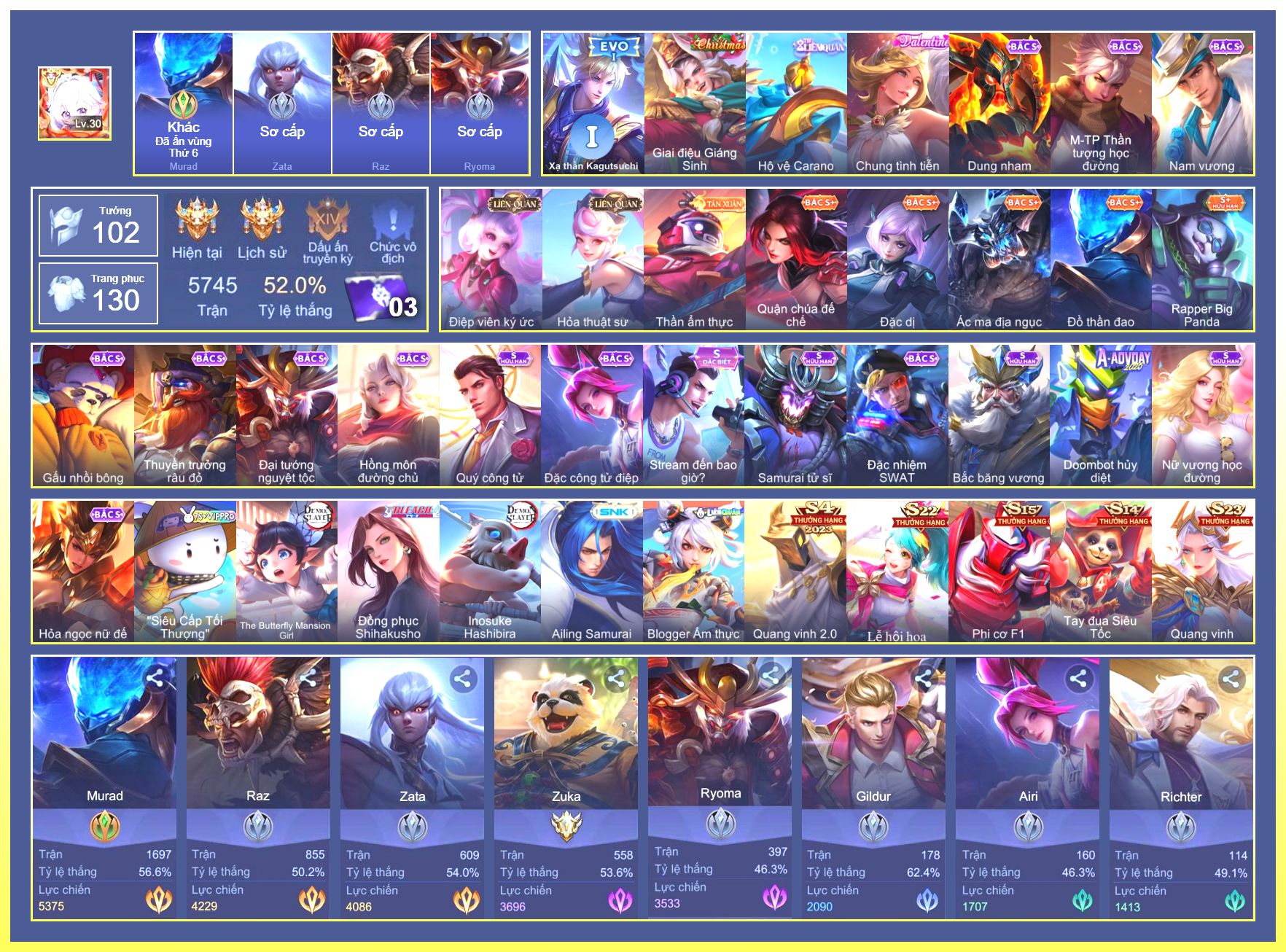 Nổi bật: Rất Nhiều Skin Đẹp Vip.Ngọc 90.Dư 2 Đá Quý.Liliana Nguyệt Mị Ly.Slimz Siêu Cấp Tối Thượng.Zephys Inosuke Hashibira.Astrid Siêu Sao Bóng Chày...